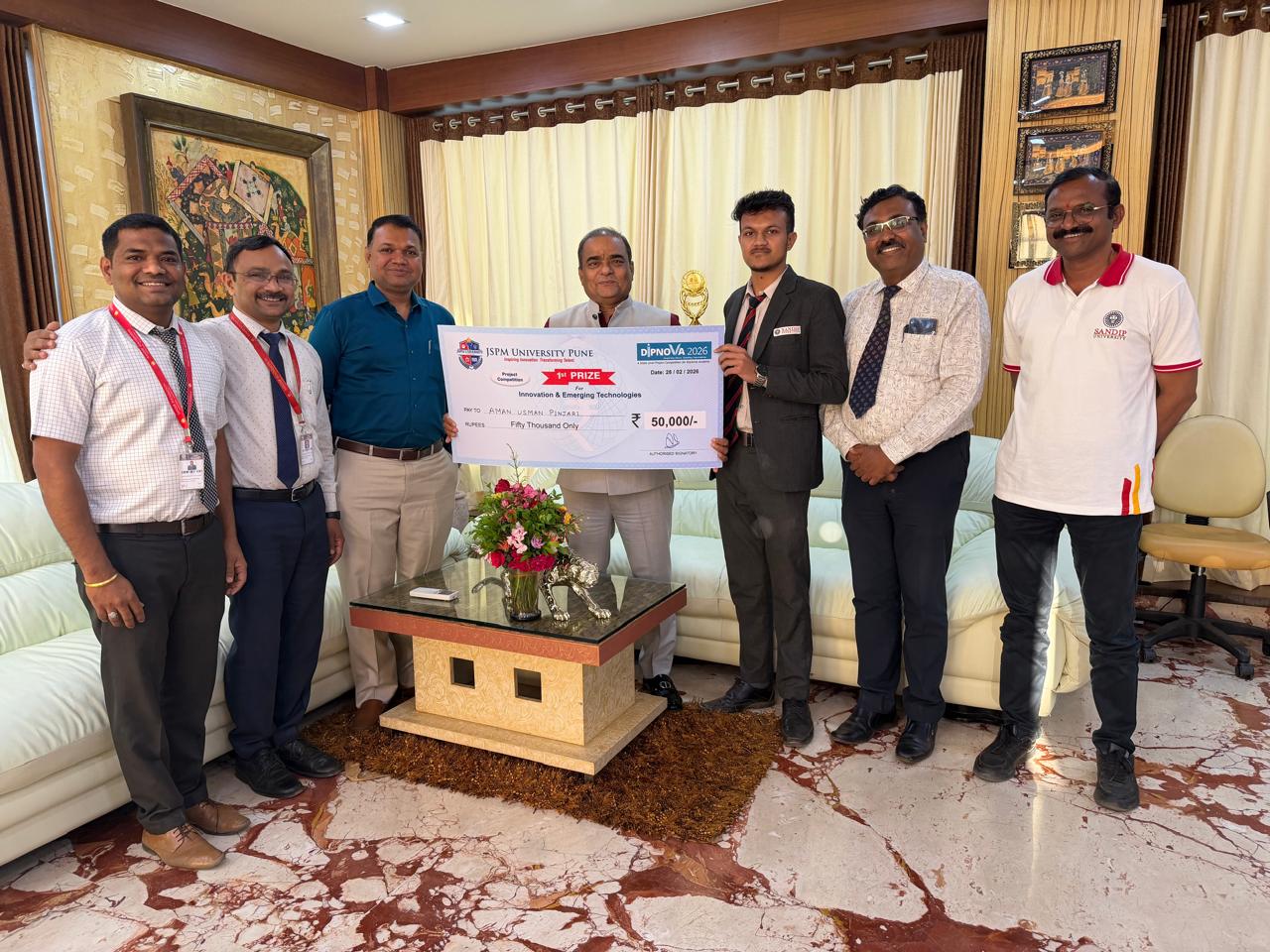 “Mr. Aman Pinjari , Student of Third year Mechanical engineering ,Sandip Polytechnic (2025-26) is felicitated by Prof. Sandip Zha ( Hon. Chairman , Sandip Foundation , Nashik) for wining First Prize worth Rs. 50000/-  at “DipNova Project Competition”  organized by JSPM University Pune in association with Directorate of Technical education , Maharashtra.